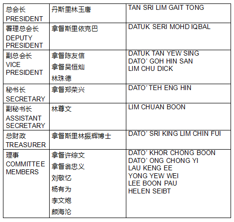 全体新届理事合照。中为总会长丹斯里林玉唐,左起为李建源、戴小华、林尊文、林珠德、拿督斯里依克巴;右起为李文炮、拿督许综文、杨有为、拿督陈友信、拿督郑荣兴。